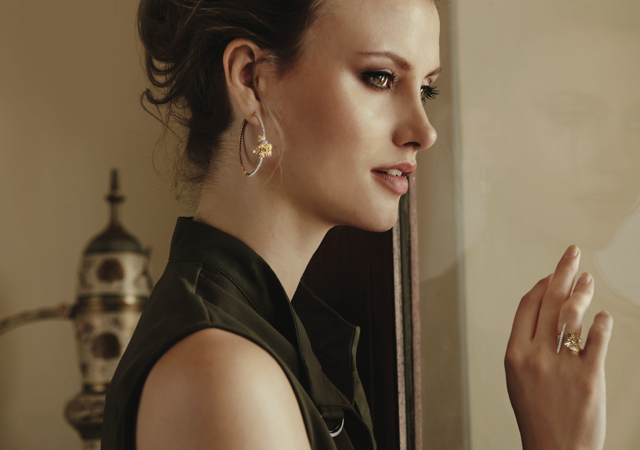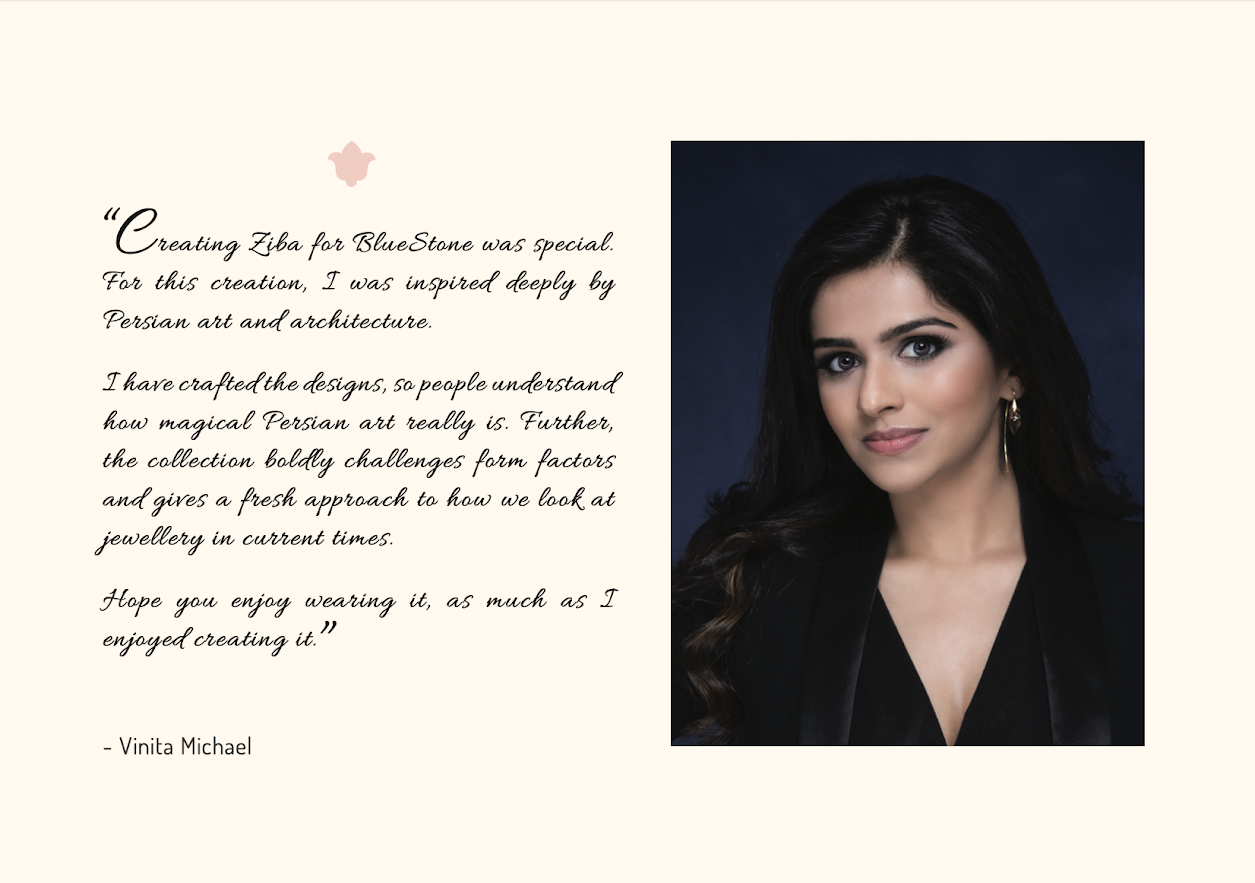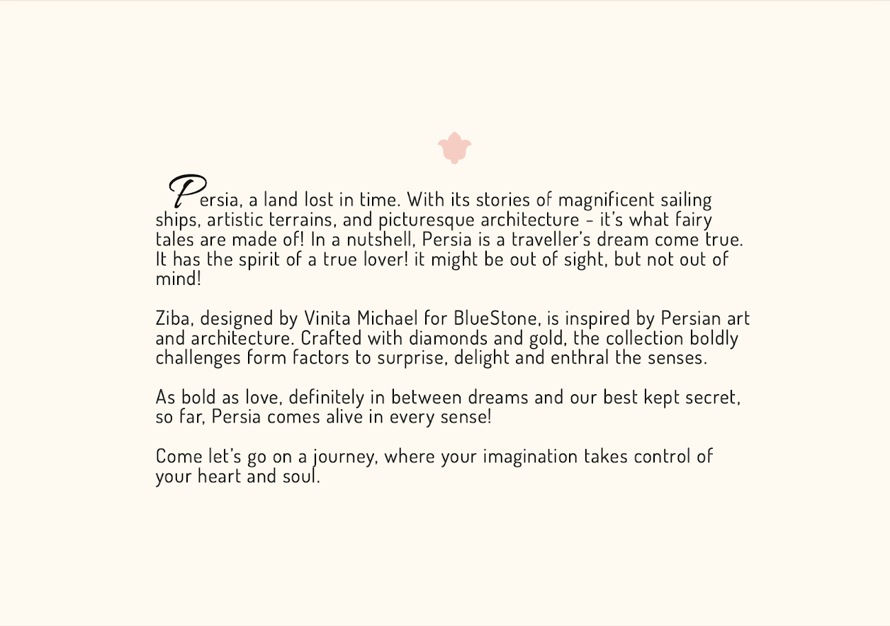 Ziba, designed for bluestone.com, is inspired by Persian art and architecture. Crafted with diamonds and gold, the collection boldly challenges form factors to surprise, delight and enthrall the senses.