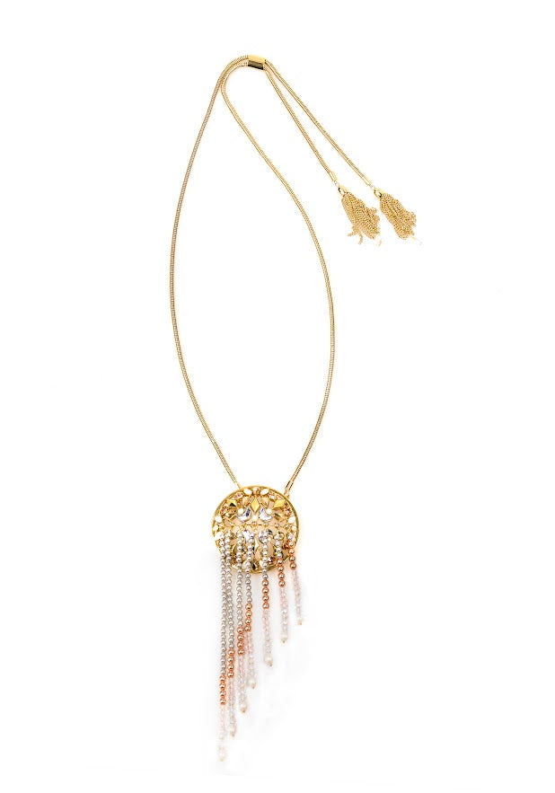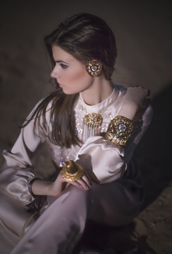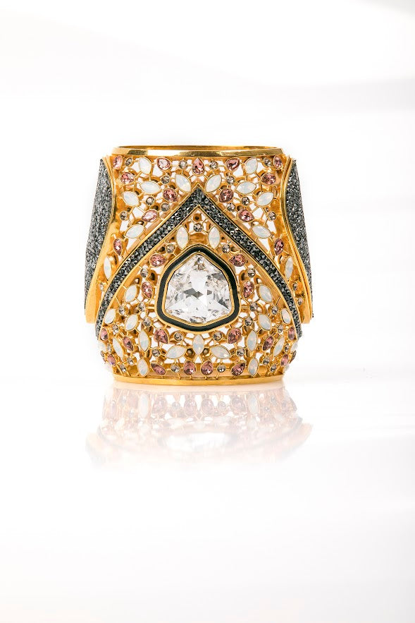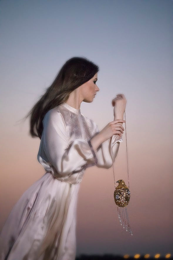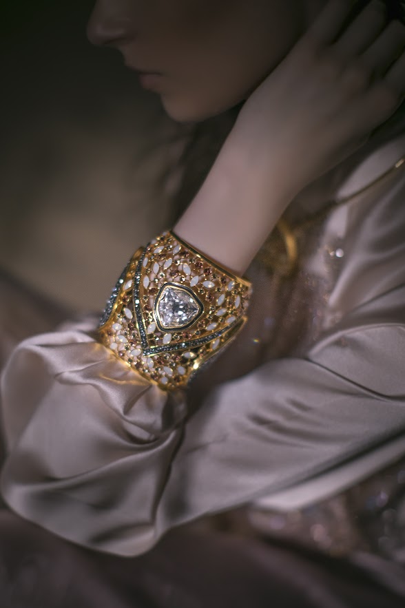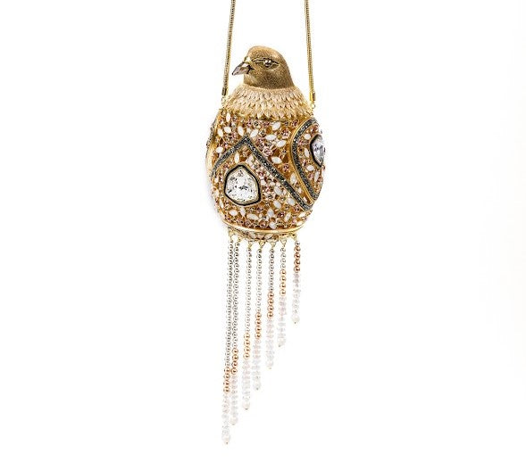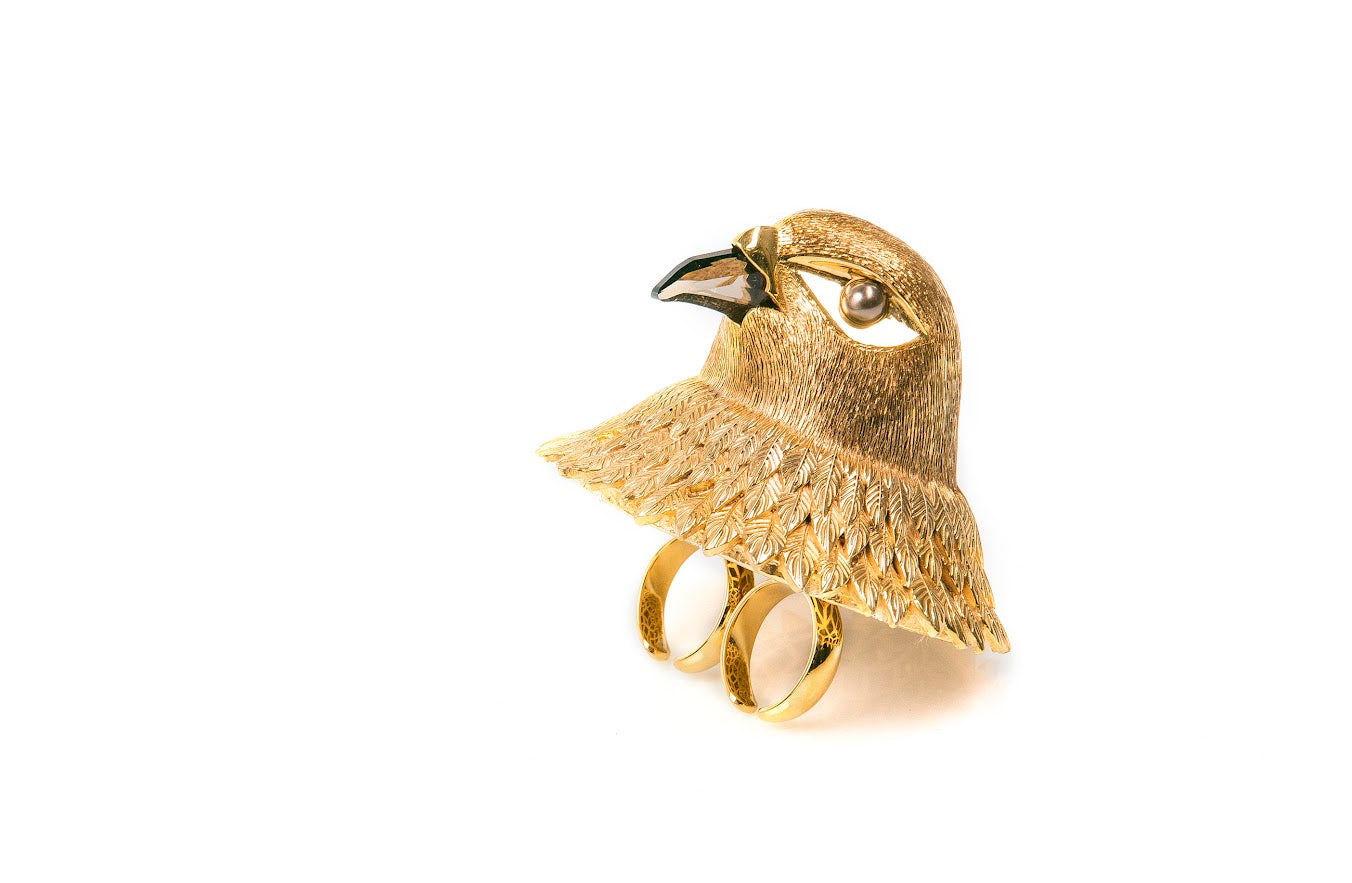 A bejeweled 'falcon clutch' that deconstructs into jewelry pieces was designed and crafted for the event. The clutch opens up to reveal a statement falcon ring, a cuff, a pair of oversized earrings and a necklace with tassel detail.